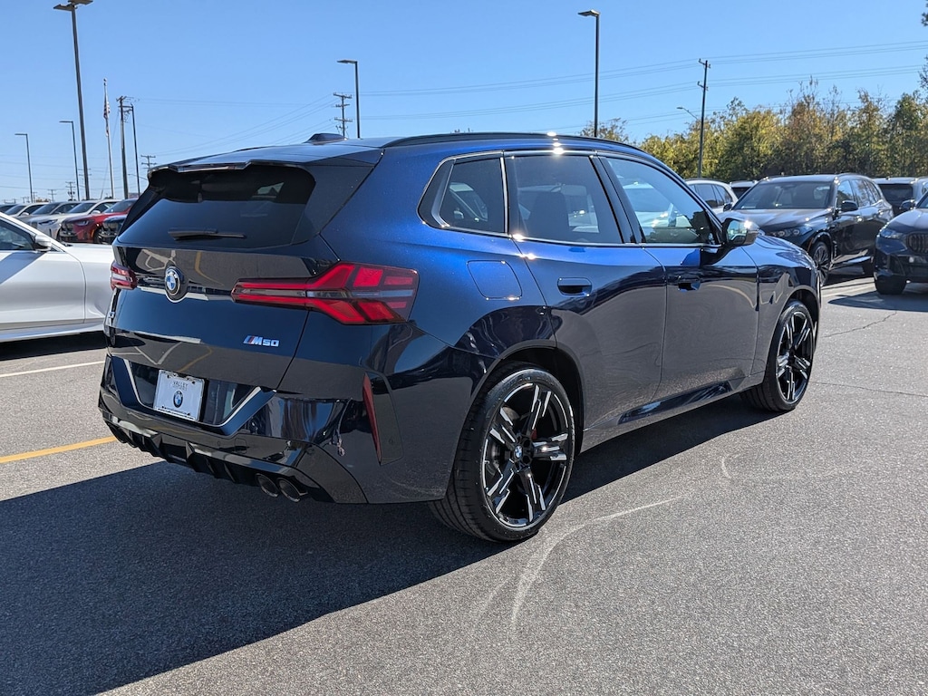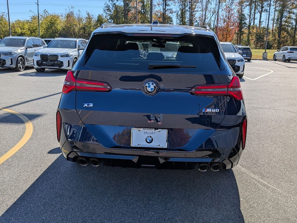 Tanzanite Blue II Metallic 2026 BMW X3 M50 xDrive AWD 8-Speed Automatic I6 8-Speed Automatic, 12 Speakers, 4-Wheel Disc Brakes, ABS brakes, Adaptive suspension, Air Conditioning, Alloy wheels, AM/FM Radio, AM/FM radio: SiriusXM, Apple CarPlay and Android Auto Compatibility, Auto High-beam Headlights, Auto-dimming door mirrors, Auto-dimming Rear-View mirror, Automatic temperature control, BMW Assist ECall, BMW Curved Display with HUD, BMW TeleServices, Brake assist, Bumpers: body-color, Delay-off headlights, Distance Control (ACC) with Steering Assistant, Driver door bin, Driver vanity mirror, Driving Assistance Plus, Driving Assistance Professional Package, Driving Assistant Professional, Dual front impact airbags, Dual front side impact airbags, Electronic Stability Control, Emergency communication system: BMW Assist eCall, Extended Shadowline Trim, Exterior Parking Camera Rear, Four wheel independent suspension, Front anti-roll bar, Front Bucket Seats, Front Center Armrest, Front reading lights, Full LED Headlights with Cornering Light, Fully automatic headlights, Garage door transmitter, Harman/Kardon Surround Sound System, Heated door mirrors, Heated Front Seats, Heated front seats, Heated steering wheel, Hi-Fi Sound System, Illuminated entry, Interior Camera, Knee airbag, Lane Change Assistant, Leather steering wheel, Low tire pressure warning, Lumbar Support, M Sport Brake with Blue Calipers, M Sport Brakes with Red Calipers, M Sport Package Pro, M Sport Professional Package, Memory seat, Navigation, Navigation system: BMW Maps Navigation, Occupant sensing airbag, Outside temperature display, Overhead airbag, Overhead console, Panic alarm, Parking Assistant Plus, Parking View with 3D View (Surround View), Passenger door bin, Passenger vanity mirror, Personal ESIM 5G, Power door mirrors, Power driver seat, Power Front Seats, Power Liftgate, Power moonroof: Panoramic, Power passenger seat, Power steering, Power windows, Premium Content 1, Premium Package, Radio data system, Rain sensing wipers, Rear anti-roll bar, Rear reading lights, Rear seat center armrest, Rear window defroster, Rear window wiper, Remote keyless entry, Security system, SiriusXM with 360L and 1 Year Trial Subscription, Speed control, Speed-sensing steering, Speed-Sensitive Wipers, Split folding rear seat, Spoiler, Sport Seats, Sport steering wheel, Steering wheel mounted audio controls, Tachometer, Telescoping steering wheel, Tilt steering wheel, Traction control, Traffic Jam Assistant, Trip computer, Turn signal indicator mirrors, Variably intermittent wipers, Veganza Perforated and Quilted Upholstery, Wheels: 20" x 9" Front and 20" x 10.5" Rear M Jet Black, Wheels: 21" x 9" Front and 21" x 10.5" Rear Bicolor, Wireless Device Charging, 8-Speed Automatic.