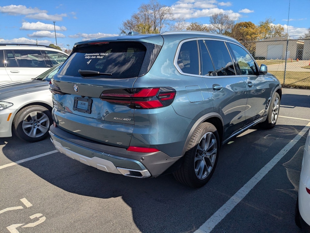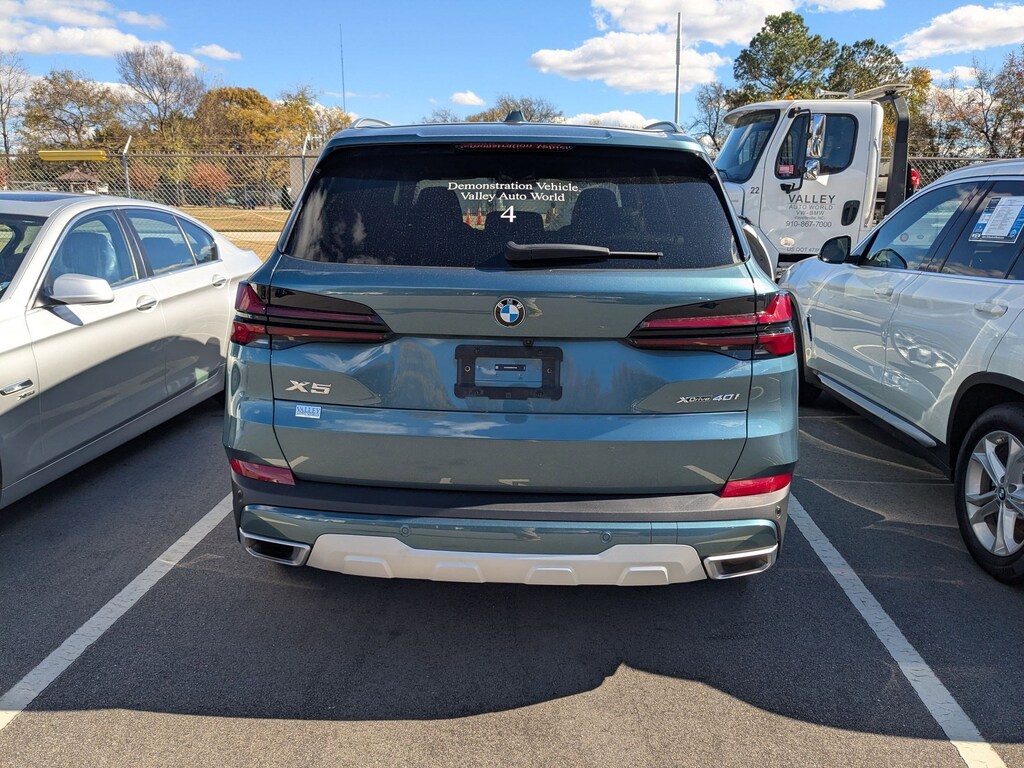 Clean CARFAX. Blue Ridge Mountain Metallic 2025 BMW X5 xDrive40i AWD 8-Speed Automatic Sport 3.0L I6 DOHC 24V Black Premium Synthetic, 10 Speakers, 4-Wheel Disc Brakes, 4-Zone Automatic Climate Control, ABS brakes, Active Park Distance Control, Air Conditioning, Alloy wheels, AM/FM radio: SiriusXM with 360L, AM/FM Stereo, Apple CarPlay & Android Auto Compatibility, Apple CarPlay Compatibility, Auto High-beam Headlights, Auto tilt-away steering wheel, Auto-dimming door mirrors, Auto-dimming Rear-View mirror, Automatic temperature control, BMW Assist eCall, BMW TeleServices, Brake assist, Bumpers: body-color, Climate Comfort Package, Compass, Connected Package Pro, ConnectedDrive Services, Delay-off headlights, Driver door bin, Driver vanity mirror, Dual front impact airbags, Dual front side impact airbags, Electronic Stability Control, Emergency communication system: BMW Assist eCall, Exterior Parking Camera Rear, Four wheel independent suspension, Front & Rear Heated Seats, Front anti-roll bar, Front Bucket Seats, Front Center Armrest, Front dual zone A/C, Front Massaging Seats, Front reading lights, Front Ventilated Seats, Fully automatic headlights, Garage door transmitter, Genuine wood console insert, Genuine wood dashboard insert, Genuine wood door panel insert, Gesture Control, harman/kardon Surround Sound System, Head restraints memory, Heated door mirrors, Heated Front Seats, Heated front seats, Heated Front Seats, Armrests & Steering Wheel, Hi-Fi Sound System, Illuminated entry, Knee airbag, Leather Shift Knob, Leather steering wheel, Live Cockpit Pro, Low tire pressure warning, Lumbar Support, Memory seat, Multi-Contour Seats, Navigation, Navigation System, Occupant sensing airbag, Outside temperature display, Overhead airbag, Panic alarm, Parking Assistance Package, Parking Assistant Professional, Parking View w/3D View (Surround View), Passenger door bin, Passenger vanity mirror, Personal eSIM 5G, Power adjustable front head restraints, Power door mirrors, Power driver seat, Power Front Seats, Power moonroof, Power passenger seat, Power steering, Power windows, Premium Package, Radio data system, Rain sensing wipers, Rear anti-roll bar, Rear reading lights, Rear seat center armrest, Rear window defroster, Rear window wiper, Rear-View Camera, Remote Engine Start, Remote keyless entry, Security system, Sensafin Upholstery, SiriusXM Satellite Radio, Speed control, Speed-sensing steering, Speed-Sensitive Wipers, Split folding rear seat, Spoiler, Sport Seats, Sport steering wheel, Steering wheel memory, Steering wheel mounted audio controls, Tachometer, Telescoping steering wheel, Tilt steering wheel, Traction control, Trip computer, Turn signal indicator mirrors, Variably intermittent wipers, Wheels: 20" x 9" V-Spoke (Style 738), Wireless Device Charging, Black Premium Synthetic.