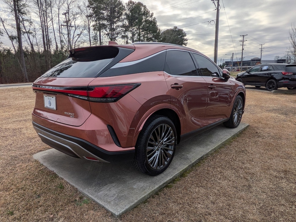 Copper Crest 2023 Lexus RX 350 Luxury AWD 8-Speed Automatic 2.4L I4 PDI Turbocharged DOHC 16V LEV3-SULEV30 275hp AWD, Birch w/Black Open Pore w/Leather Seat Trim, 10-Way Power Driver & Fr Passenger Seat Adjusters, 12 Speakers, 3.33 Axle Ratio, 4-Wheel Disc Brakes, ABS brakes, Air Conditioning, Alloy wheels, AM/FM radio: SiriusXM, Anti-whiplash front head restraints, Auto High-beam Headlights, Auto tilt-away steering wheel, Auto-dimming door mirrors, Auto-dimming Rear-View mirror, Automatic temperature control, Brake assist, Bumpers: body-color, Compass, Delay-off headlights, Driver door bin, Driver vanity mirror, Dual front impact airbags, Dual front side impact airbags, Electronic Stability Control, Emergency communication system: Safety Connect (10-year trial), Exterior Parking Camera Rear, Finish Plate Door Inner Garnish, Four wheel independent suspension, Front anti-roll bar, Front Bucket Seats, Front Center Armrest, Front dual zone A/C, Front fog lights, Front reading lights, Fully automatic headlights, Garage door transmitter: HomeLink, Genuine wood console insert, Heads-Up Display, Heated & Ventilated Front Bucket Seats, Heated door mirrors, Heated front seats, Heated steering wheel, Illuminated entry, Leather Shift Knob, Leather steering wheel, Low tire pressure warning, Memory seat, Multi-Color Illuminated Entry System, Navigation System, Occupant sensing airbag, Outside temperature display, Overhead airbag, Overhead console, Panic alarm, Parking Support Alert/Brake, Passenger door bin, Passenger vanity mirror, Power door mirrors, Power driver seat, Power Liftgate, Power moonroof, Power passenger seat, Power steering, Power windows, Radio data system, Radio: Lexus Interface w/14" HD Touchscreen Display, Rain sensing wipers, Rear air conditioning, Rear anti-roll bar, Rear reading lights, Rear seat center armrest, Rear side impact airbag, Rear window defroster, Rear window wiper, Remote keyless entry, Security system, Semi-Aniline/Synthetic Suede Leather Seat Trim, Speed control, Speed-sensing steering, Split folding rear seat, Spoiler, Steering wheel memory, Steering wheel mounted audio controls, Tachometer, Telescoping steering wheel, Tilt steering wheel, Traction control, Trip computer, Turn signal indicator mirrors, Variably intermittent wipers, Wheels: 21", Wireless Apple CarPlay/Wireless Android Auto, Wireless Charger, Wood Steering Wheel w/Paddle & Heater, AWD, Birch w/Black Open Pore w/Leather Seat Trim.