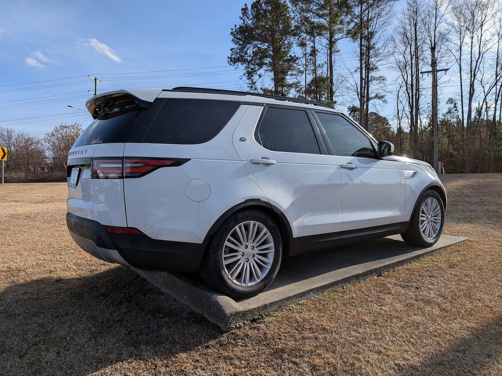 Clean CARFAX. Yulong White Metallic 2019 Land Rover Discovery HSE Luxury 4WD ZF 8-Speed Automatic V6 Supercharged 15 Speakers, 20" Wheels, 3.73 Axle Ratio, 3rd row seats: split-bench, 4-Wheel Disc Brakes, ABS brakes, Air Conditioning, Alloy wheels, AM/FM radio: SiriusXM, Auto High-beam Headlights, Auto tilt-away steering wheel, Auto-dimming door mirrors, Auto-dimming Rear-View mirror, Auto-leveling suspension, Automatic temperature control, Brake assist, Bumpers: body-color, CD player, Compass, Delay-off headlights, Driver door bin, Driver vanity mirror, Driver's Seat Mounted Armrest, Dual front impact airbags, Dual front side impact airbags, DVD-Audio, Electronic Stability Control, Emergency communication system: InControl Protect, Exterior Parking Camera Rear, Four wheel independent suspension, Front anti-roll bar, Front Bucket Seats, Front Center Armrest, Front dual zone A/C, Front fog lights, Front reading lights, Fully automatic headlights, Garage door transmitter: HomeLink, Genuine wood dashboard insert, Genuine wood door panel insert, Heated door mirrors, Heated Dr/Pass 16 Way Fr Seats w/Memory - Style 4, Heated front seats, Heated rear seats, Heated steering wheel, Illuminated entry, Low tire pressure warning, Memory seat, Navigation system: InControl Touch Pro Navigation System, Occupant sensing airbag, Outside temperature display, Overhead airbag, Overhead console, Panic alarm, Passenger door bin, Passenger seat mounted armrest, Passenger vanity mirror, Power door mirrors, Power driver seat, Power Liftgate, Power moonroof, Power passenger seat, Power steering, Power windows, Premium audio system: Meridian, Radio data system, Radio: Meridian Surround Sound System (825 Watts), Rain sensing wipers, Rear air conditioning, Rear anti-roll bar, Rear fog lights, Rear reading lights, Rear seat center armrest, Rear window defroster, Rear window wiper, Remote keyless entry, Security system, SiriusXM Satellite Radio & HD Radio, Speed control, Speed-sensing steering, Speed-Sensitive Wipers, Split folding rear seat, Spoiler, Steering wheel memory, Steering wheel mounted audio controls, Tachometer, Telescoping steering wheel, Tilt steering wheel, Traction control, Trip computer, Turn signal indicator mirrors, Variably intermittent wipers, Weather band radio, Wheels: 20" 10 Split-Spoke, Windsor Leather Seat Trim.