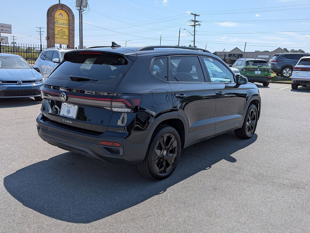 Clean CARFAX. Deep Black 2025 Volkswagen Taos 1.5T SE Black FWD 8-Speed Automatic with Tiptronic 1.5L I4 Turbocharged DOHC 16V LEV3-SULEV30 174hp 4-Wheel Disc Brakes, 6 Speakers, ABS brakes, Active Blind Spot Monitor, Air Conditioning, Alloy wheels, AM/FM radio: SiriusXM with 360L, Auto High-beam Headlights, Automatic temperature control, Brake assist, Bumpers: body-color, Cloudtex and Cloth Seating Surfaces, Compass, Delay-off headlights, Driver door bin, Driver vanity mirror, Dual front impact airbags, Dual front side impact airbags, Electronic Stability Control, Emergency communication system: VW Car-Net Safe & Secure 5-year, Exterior Parking Camera Rear, Front anti-roll bar, Front Bucket Seats, Front Center Armrest, Front dual zone A/C, Front reading lights, Front Strut Rear Torsion Beam Suspension, Front wheel independent suspension, Fully automatic headlights, Heated door mirrors, Heated Front Bucket Seats, Heated front seats, Heated steering wheel, Illuminated entry, Leather Shift Knob, Low tire pressure warning, Occupant sensing airbag, Outside temperature display, Overhead airbag, Overhead console, Panic alarm, Passenger door bin, Passenger vanity mirror, Power door mirrors, Power driver seat, Power moonroof, Power steering, Power windows, Radio data system, Radio: MIB3 Composition Media AM/FM/HD, Rain sensing wipers, Rear anti-roll bar, Rear seat center armrest, Rear window defroster, Rear window wiper, Remote keyless entry, Security system, Speed control, Speed-sensing steering, Split folding rear seat, Spoiler, Steering wheel mounted audio controls, Tachometer, Telescoping steering wheel, Tilt steering wheel, Traction control, Trip computer, Variably intermittent wipers, Wheels: 18" Black Painted Alloy.