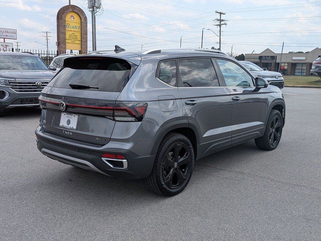 Clean CARFAX. Platinum Gray 2025 Volkswagen Taos 1.5T SEL AWD 8-Speed Automatic with Tiptronic 1.5L I4 Turbocharged DOHC 16V LEV3-SULEV30 174hp 4-Wheel Disc Brakes, 6 Speakers, ABS brakes, Active Blind Spot Monitor, Air Conditioning, Alloy wheels, AM/FM radio: SiriusXM with 360L, Auto High-beam Headlights, Auto-dimming Rear-View mirror, Automatic temperature control, Brake assist, Bumpers: body-color, Compass, Delay-off headlights, Driver door bin, Driver vanity mirror, Dual front impact airbags, Dual front side impact airbags, Electronic Stability Control, Emergency communication system: VW Car-Net Safe & Secure 5-year, Exterior Parking Camera Rear, Four wheel independent suspension, Front anti-roll bar, Front Bucket Seats, Front Center Armrest, Front dual zone A/C, Front reading lights, Front Strut Rear Multi-Link Suspension, Fully automatic headlights, Heated & Actively Ventilated Front Bucket Seats, Heated door mirrors, Heated front seats, Heated steering wheel, Illuminated entry, Leather Shift Knob, Low tire pressure warning, Navigation system: VW Car-Net Guide & Inform, Occupant sensing airbag, Outside temperature display, Overhead airbag, Overhead console, Panic alarm, Passenger door bin, Passenger vanity mirror, Perforated Vienna Leather Seating Surfaces, Power door mirrors, Power driver seat, Power moonroof, Power steering, Power windows, Radio data system, Radio: MIB3 Discover Media AM/FM/HD, Rain sensing wipers, Rear anti-roll bar, Rear seat center armrest, Rear window defroster, Rear window wiper, Remote keyless entry, Security system, Speed control, Speed-sensing steering, Split folding rear seat, Spoiler, Steering wheel mounted audio controls, Tachometer, Telescoping steering wheel, Tilt steering wheel, Traction control, Trip computer, Variably intermittent wipers, Ventilated front seats, Wheels: 19" 2-Tone Machined Alloy.